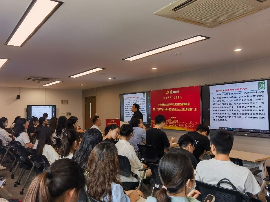 在“经世济民守初心,自强不息谋新篇”篇章中,冯玉鑫为2022-2023学年研究生党建中心副主任江欣、研究生党建中心委员陈梦婷颁发聘书。随后,聂永有开展题为《大变局时代我国的国家安全态势分析》微党课暨毕业生党员教育,以国家安全为切入点,从国家安全观的核心要义、基本内涵、贯彻总体国家安全观的具体要求等方面进行了深刻阐释和详细解读。