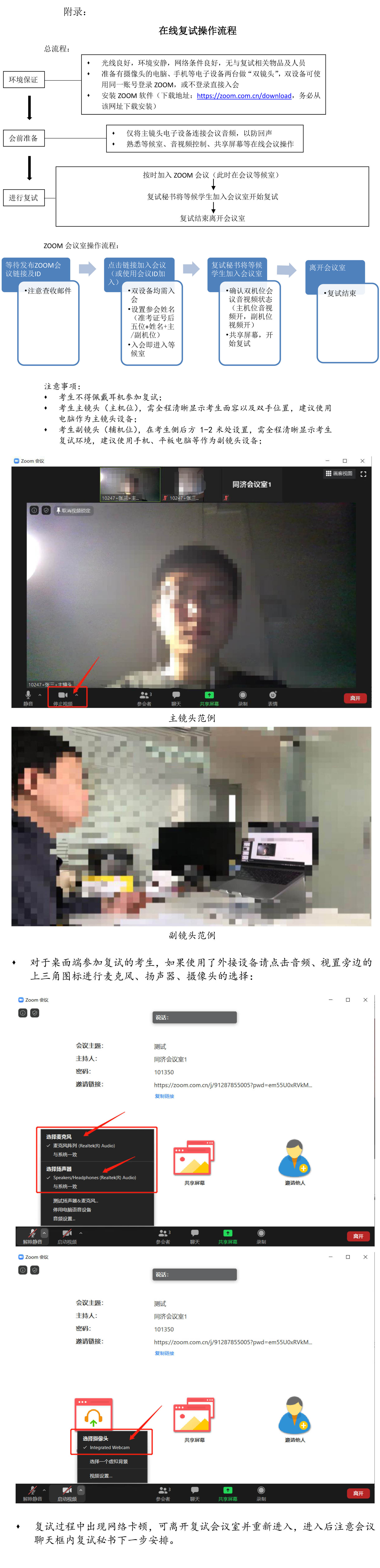注:具体安排详见学院复试通知,并及时查收考生提供的邮箱。 2. 复试平台为 "Zoom"远程会议系统; 3. 复试前考生需对zoom平台提前测试,具体操作流程参见附录(附录:在线复试操作流程)。