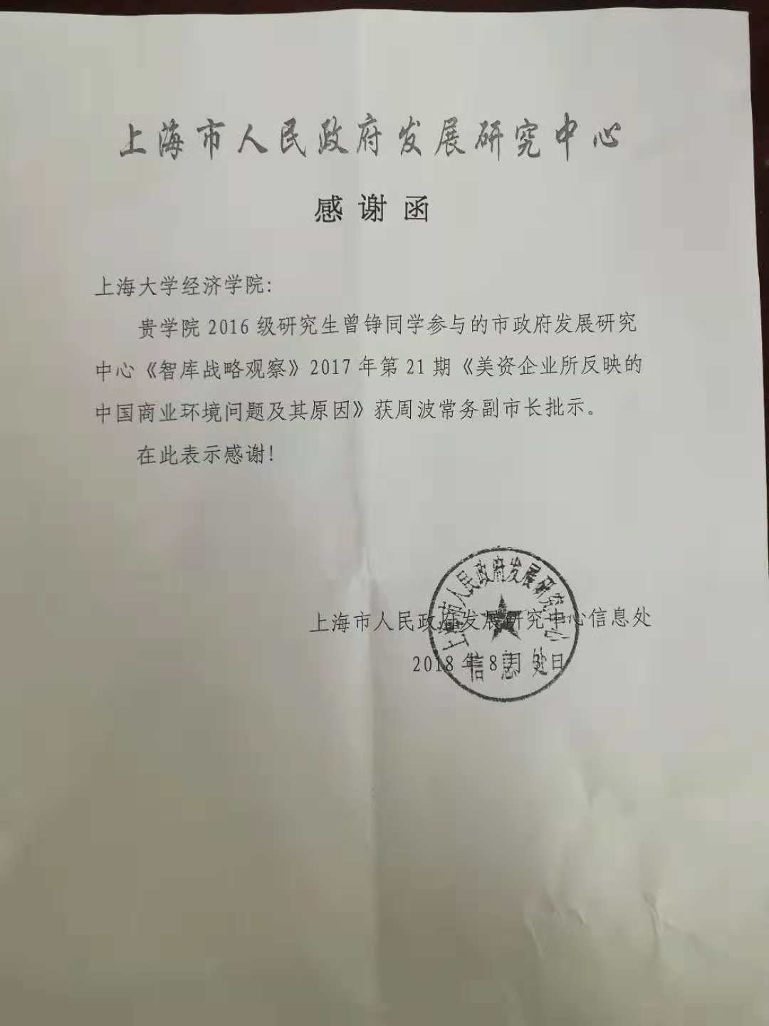 英国上市公司3652016级研究生曾铮同学参与了市政府发展研究中心—《智库战略观察》2017年第21期《美资企业所反映的中国商业环境问题及其原因》。以上获得周波常务副市长批示,并且上海市人民政府发展研究中心特地发来感谢函,祝贺曾铮同学!