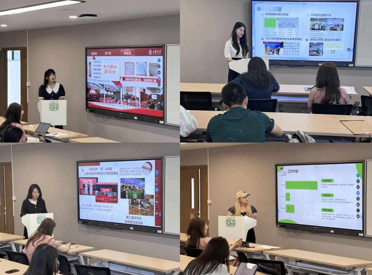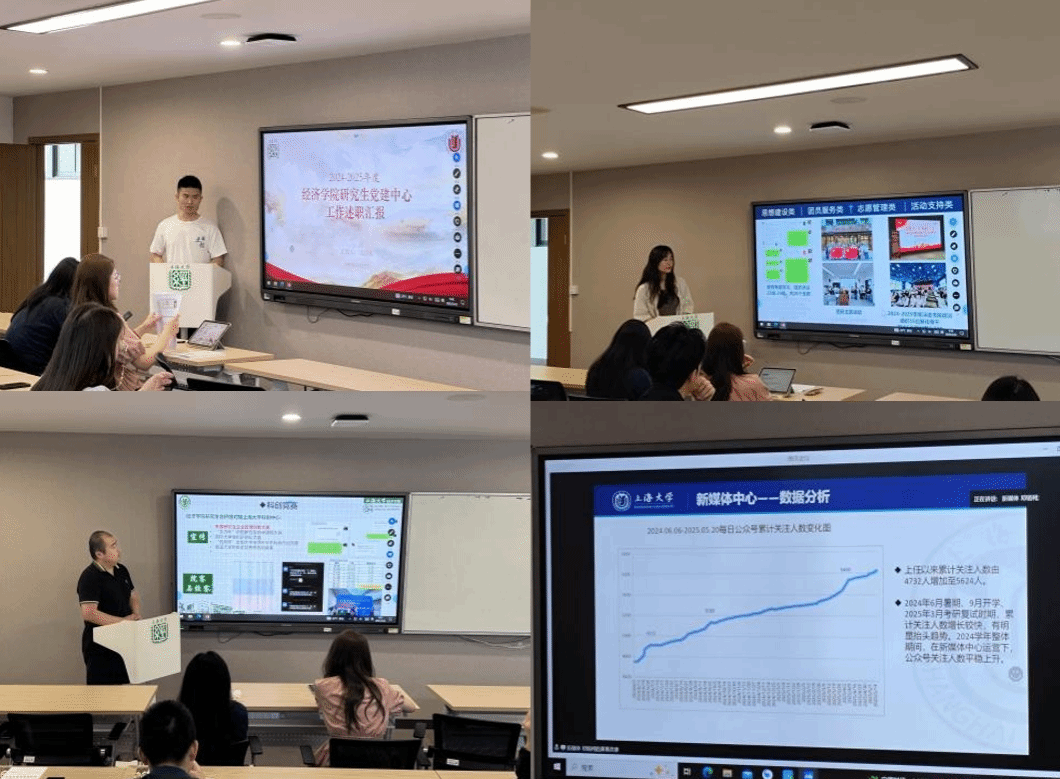 一、述职总结:回眸耕耘路,蓄力再出发活动伊始,研究生党建中心、团总支、研究生会、新媒体中心四大组织学生负责人围绕2024-2025学年的主要工作依次进行述职汇报。 研究生党建中心副主任汪国栋围绕开学迎新、党员教育、党建品牌建设等五项任务,详细介绍工作落实情况与育人成效,表示将进一步推动党建工作与学科专业发展、人才培养深度融合,为学院高质量发展注入红色动能。 团总支书记周术佳聚焦思想建设、团员服务、志愿管理、活动支持四大模块,系统总结团总支的工作亮点,指出下一步将持续提升组织力、引领力、服务力,为研究生团员成长成才搭建坚实平台。 研究生会主席国旭从学术活动、文体活动、宣传工作、科创竞赛等视角回顾了研会“服务同学、赋能成长”的系列工作成果,并承诺研会将始终践行“从同学中来,到同学中去”的理念,成为学院育人体系中不可或缺的桥梁纽带。 新媒体中心副主任邓铭柯以数据为支撑,呈现了学院官方平台在传播力、影响力上的突破性进展,介绍了各部门在导师采访、优秀毕业生访谈、推文撰写、海报设计等方面的优异表现,并期待未来继续“讲好经院故事,传播经院声音”,为学院宣传工作打造高质量的前沿阵地。 述职环节既是对过往工作的全面复盘,也为新一届学生组织提供了宝贵经验。