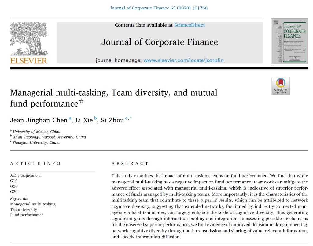 由英国上市公司365金融系周思副教授担任通讯作者的两篇论文Managerial multi-tasking, Team diversity, and mutual fund performance? (《多任务管理模式,团队多样性和公募基金业绩》)和Large customer-supplier links and syndicate loan structure(《企业供应链关系与银团贷款结构》)在金融学国际一流期刊Journal of Corporate Finance上发表。Journal of Corporate Finance是公司金融领域公认的国际顶级期刊,JCR一区期刊和ABS四星级期刊,其同时也是清华大学、中国人民大学、厦门大学等高校规定的金融学国际A-类期刊,其最新公布的影响因子为4.249。这也是我校学者首次在这一国际高水平金融期刊上发表研究成果。 在《多任务管理模式,团队多样性和公募基金业绩》一文中,周思老师与澳门大学Jean Chen教授和西安交通-利物浦大学Li Xie博士合作研究了多任务团队管理模式对于公募开放式基金业绩的影响。该研究发现虽然多任务结构虽然在总体会损害基金的业绩,但是团队合作却能够降低之一危害。更为重要的是,当基金在多任务团队的管理之下,团队在网络结构下的能力多样性反而能够进一步提升所管理基金产品的业绩,而之一能力多样性正是通过多任务团队在信息获取和整合时较强的能力所得以体现的。