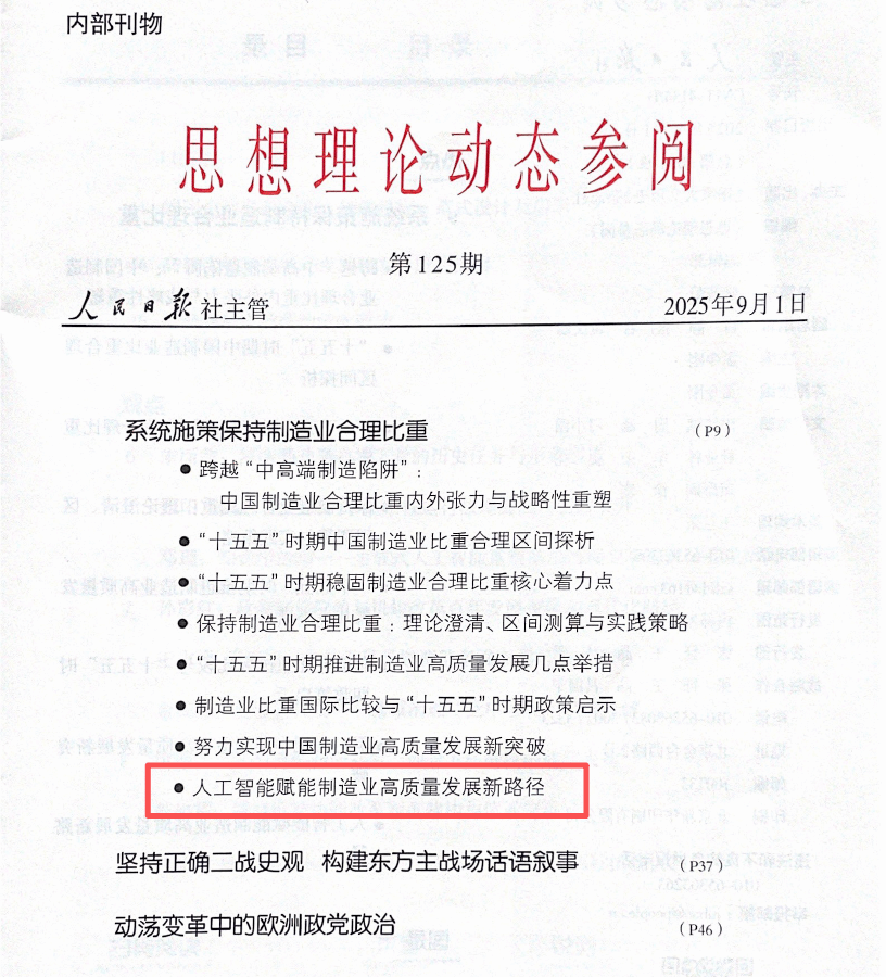 我院聂永有教授撰写的《人工智能赋能制造业高质量发展新路径》一文在人民日报社《思想理论动态参阅》2025年第125期上发表。 文章指出,当前中国制造业正处在转型升级、实现高质量发展的关键时期,人工智能作为新一轮科技革命的核心驱动力,应与制造业实现深度融合,充分发挥其赋能作用,推动产业由规模扩张向质量效益转型。 文章系统梳理了人工智能在制造业领域的应用现状,总结了包括预测性维护、质量控制在内的典型场景,以及国家在政策引导、示范工厂建设等方面的支持举措。随后,文章结合国内外实践经验,分析了人工智能与制造业融合的关键发展方向。最后,文章从加强技术创新、激活数据要素、完善产业生态等多个角度提出了具体建议,为实现人工智能与制造业深度融合、支撑制造业实现质量效益提升提供了有针对性的思路。