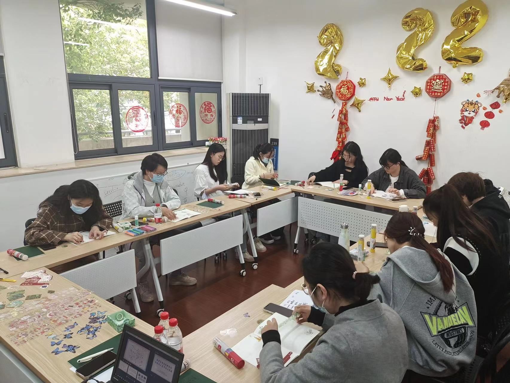 林老师首先向大家介绍了本次活动的两个关键词——“导学思政”和“美育润心”。导学思政主要是以导学关系为载体,以多元的互动场景为纽带,重视以非学术环境下的师生非正式互动。习近平总书记强调,要坚持以美育人、以文化人,提高学生审美和人文素养。美育不仅能提升人的审美素养,还能潜移默化地影响人的情感、趣味、气质,温润人的心灵,当前大学生处在身心成长的重要阶段,面临着学习、就业、情感等多重压力,更加需要美育的润心和滋养。本次活动主要内容是运用身边的上大元素制作手账本,现场为大家准备了贴纸、卡片和画笔等工具供大家发挥创意。手账本是一种集备忘录、工作日志、手绘本等为一体的多功能记事本,具有装饰性强的特点,制作手账本的过程能够让大家在这个快节奏的生活中得以休憩和享受,随后,老师与同学们一起互动式进入到手账本的制作过程中。