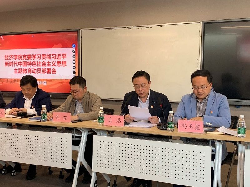孟添向师生党员传达校党委书记成旦红在学校学习贯彻习近平新时代中国特色社会主义思想主题教育动员大会上的讲话精神,强调开展好主题教育是一项重大的政治任务,是对忠诚拥护“两个确立”、坚决做到“两个维护”的现实检验,师生党员要提高政治站位,牢牢把握开展主题教育的重大意义,增强开展主题教育的责任感、使命感、紧迫感。
