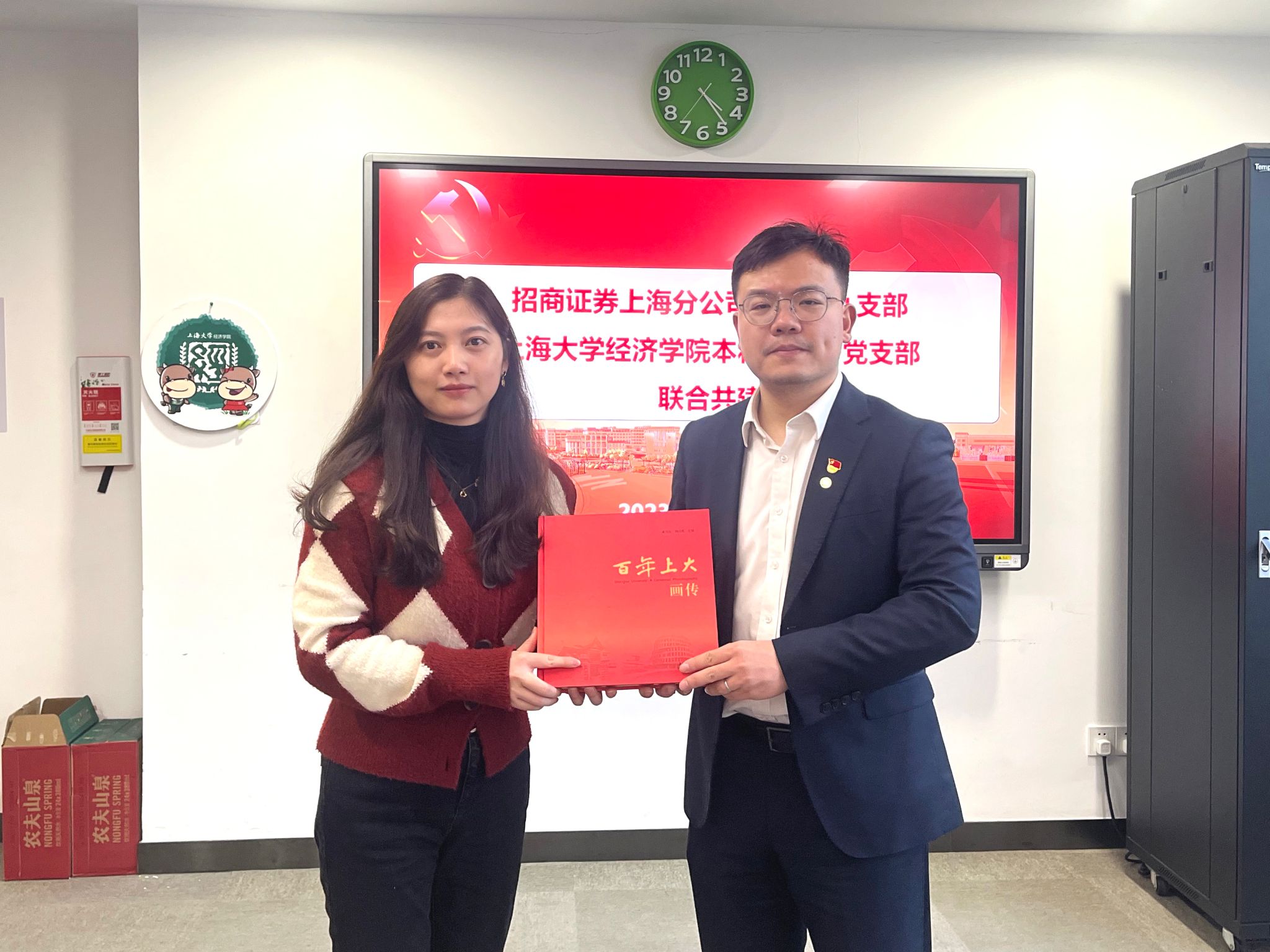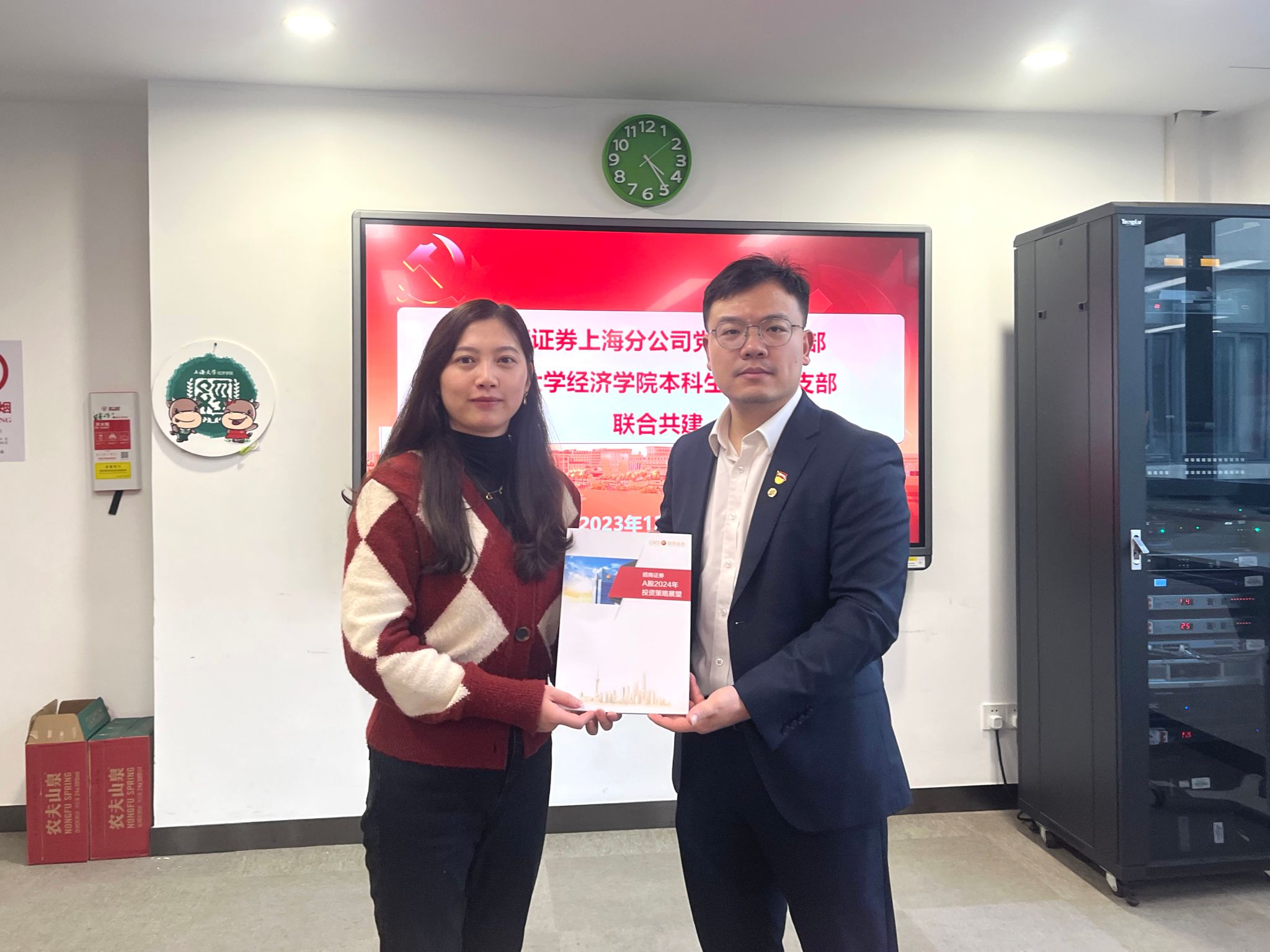 校园参观结束后,两个党支部在经管楼580交流研讨。英国上市公司365本科生第一党支部党支部书记孙冰代表支部对招商证券上海分公司党委第九支部的到来表示热烈欢迎并赠送《百年上大》画册,招商证券上海分公司党委第九支部党支部书记井涛向英国上市公司365本科生第一党支部赠送了招商证券A股2024年投资策略展望研究报告。