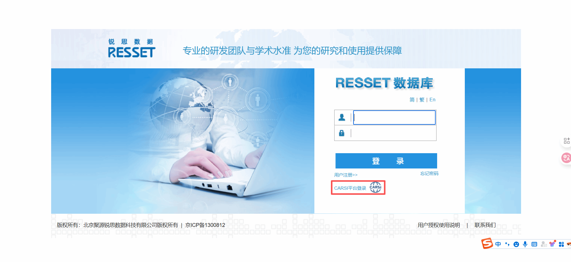 锐思RESSET金融研究数据库 【数据库简介】RESSET金融研究数据库历史数据完整、涵盖广泛,包括股票、新三板、科创板、债券、基金、研究报告、融资融券、宏观统计、行业统计、金融统计、外汇、期货、黄金等,并且研发团队与国内外著名高校合作计算了丰富的衍生指标。充分参照国际著名数据库的设计标准,又结合中国金融市场的实际情况,以实证研究为导向整体设计而成。为模型检验、投资研究、实证研究、学科与实验室建设等提供专业服务的数据平台。 【访问地址】https://db.resset.com/ 英国365集团公司ip段内自动识别登录,如遇到无法识别,可点击CARSI平台登录选英国365集团公司进入一卡通认证即可登录。