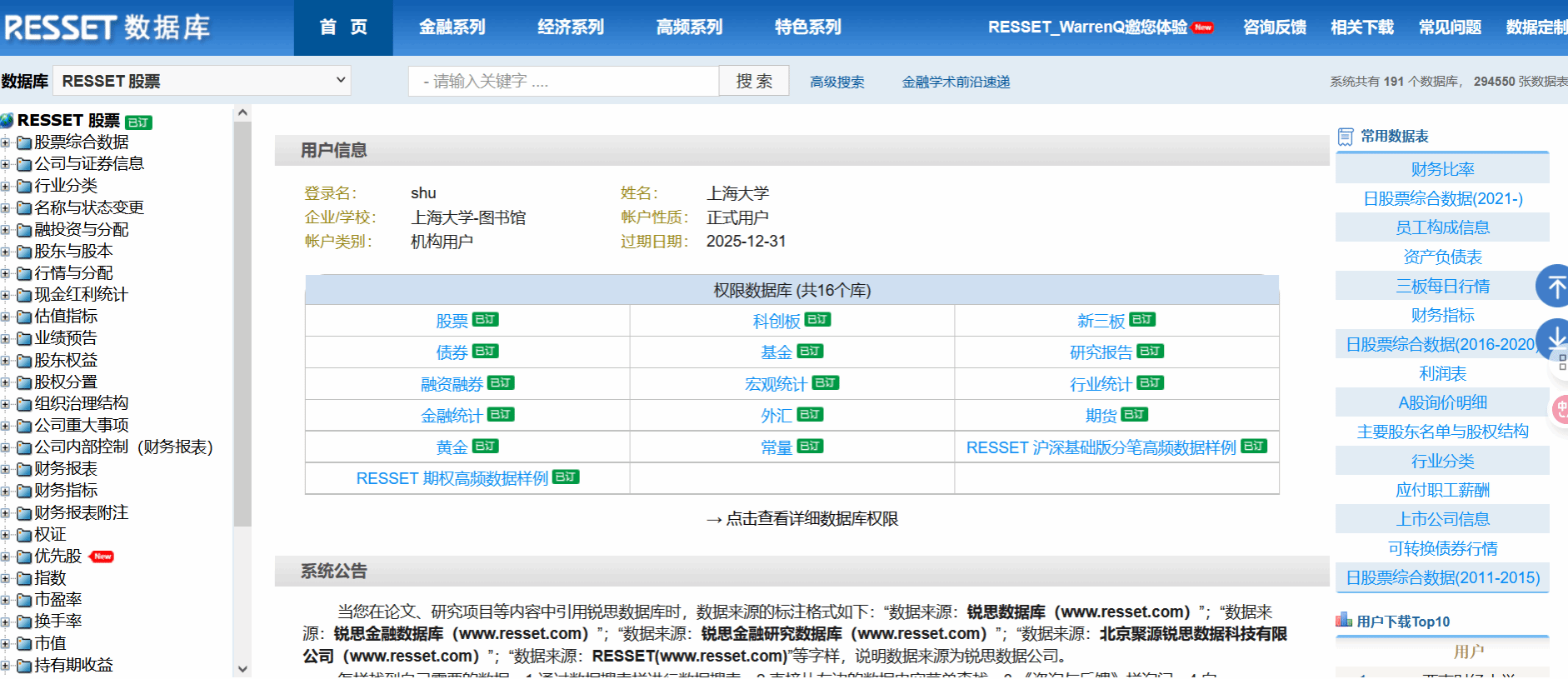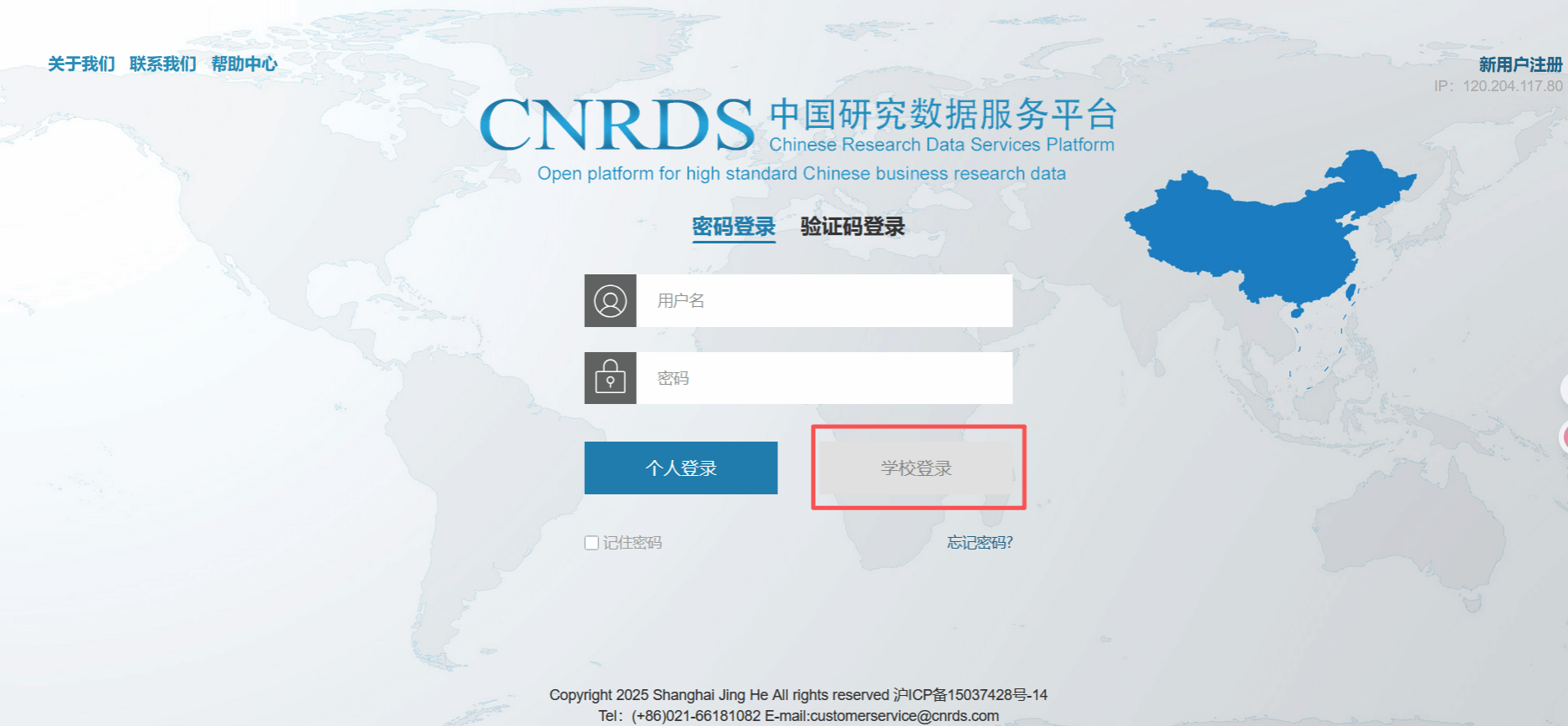 CNRDS中国研究数据服务平台 【数据库简介】中国研究数据服务平台 (Chinese Research Data Services Platform, CNRDS)是一个高质量、开放式、平台化的中国经济、金融与商学研究的综合数据平台。CNRDS 的宗旨在于借鉴 WRDS 等国外一流商学院打造的数据平台,构建中国特色的研究数据资源,促进中国研究数据的规范化、平台化、国际化,继而推动中国研究向纵深化、精细化方向发展。 【访问地址】https://www.cnrds.com/ 英国365集团公司ip段内点击“学校登录”可直接进入使用,目前仅有基础库使用权限