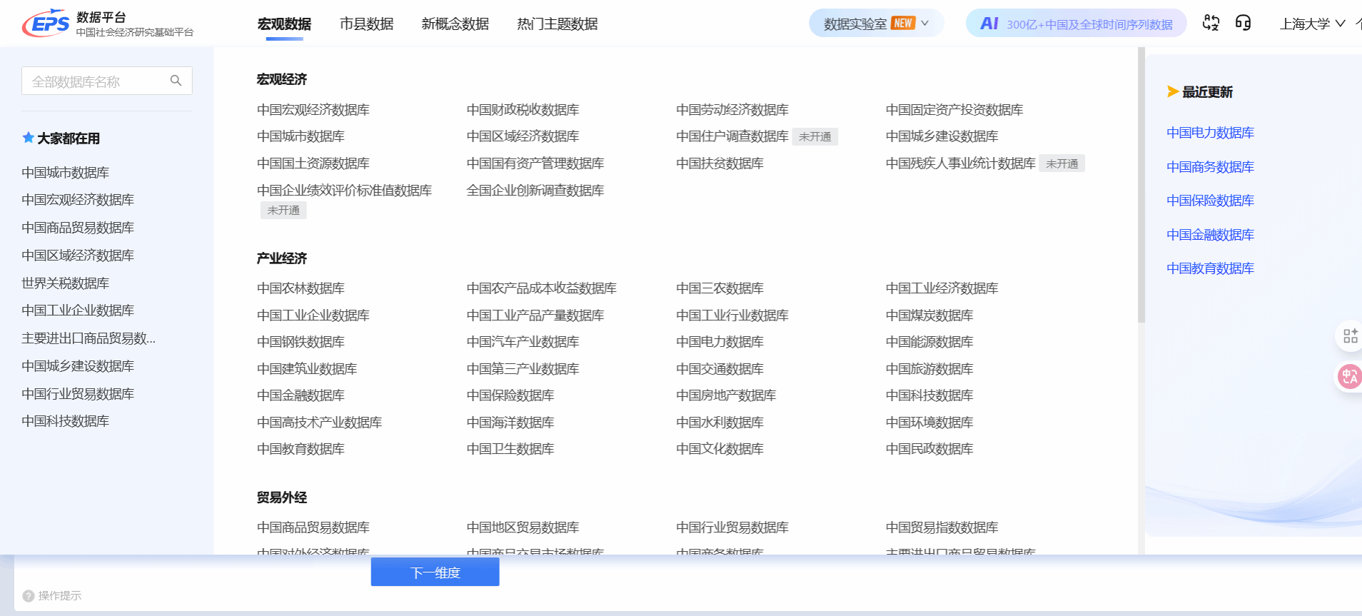 EPS中国社会经济研究基础数据平台 【数据库简介】EPS数据平台是集丰富的数值型数据资源和强大经济计量系统为一体的覆盖多学科、面向多领域的综合性统计数据与分析平台。平台涵盖宏观数据、市县数据、新概念数据和热门主题数据四大核心版块,包含150+个数据库,超过25亿条时间序列数据,数据总量超过300亿条,每年新增近20亿条。 【访问地址】https://olap.epsnet.com.cn/ 英国365集团公司ip段内自动识别登录,英国上市公司365师生也可通过已申请的个人账号进行登录访问。