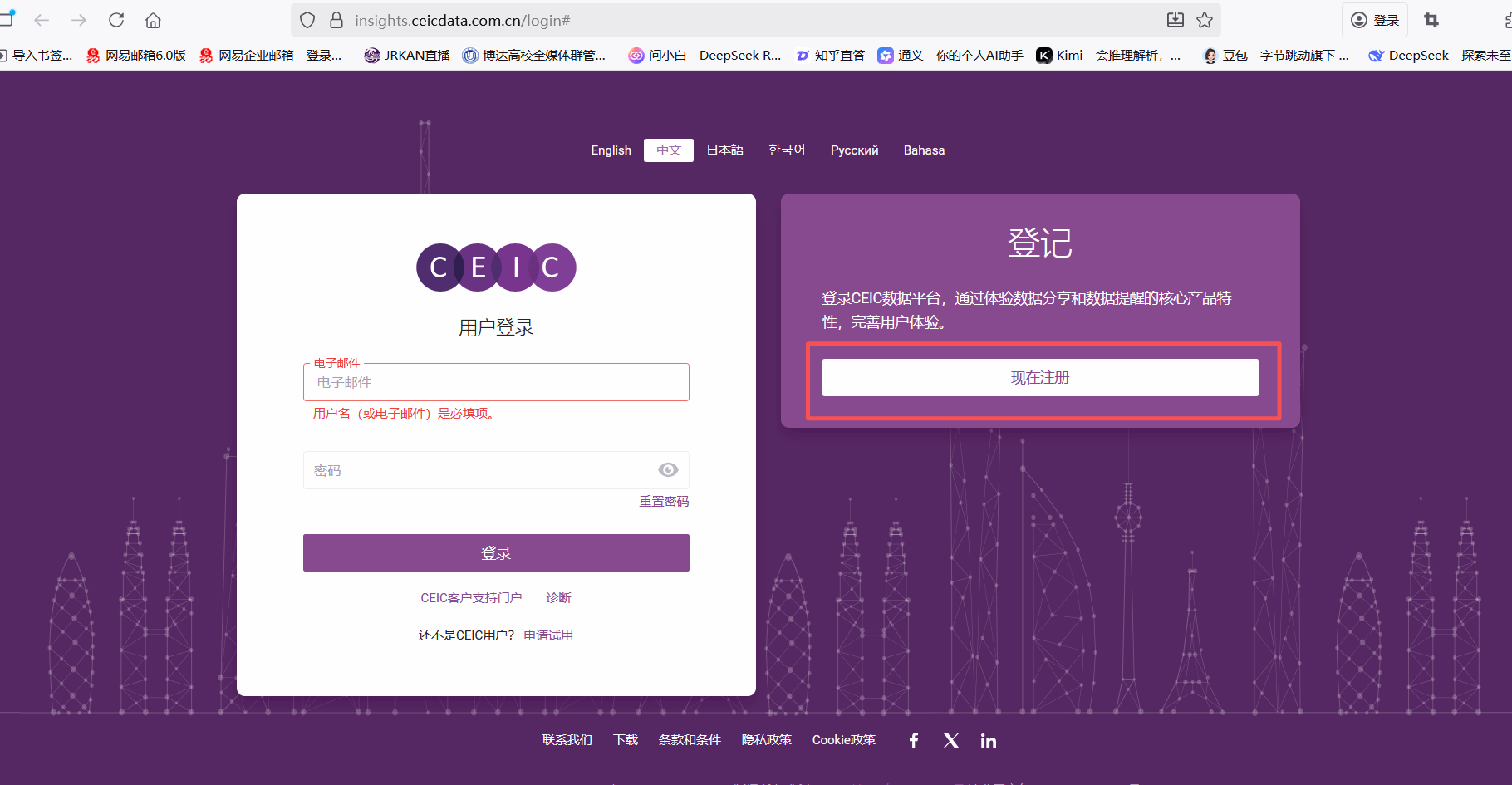 CEIC经济金融数据库 【数据库简介】CEIC 成立于 1992 年,由经济学家和分析师组成,提供有关世界发达经济和发展中经济的广泛、精确的信息。数据库覆盖 200 多个国家与地区的超过 660 万条时间序列数据,CEIC 有超过 2200 家数据来源,如,官方统计机构:国家统计局、国际基金货币组织、世界银行、经济合作与发展组织等;行业协会:世界钢铁协会,全球半导体联盟;金融信息提供商:道琼斯、标准普尔等。 【访问地址】https://insights.ceicdata.com.cn 英国365集团公司ip段内点击“现在注册”,填写相关信息注册个人账号后即可登录使用。