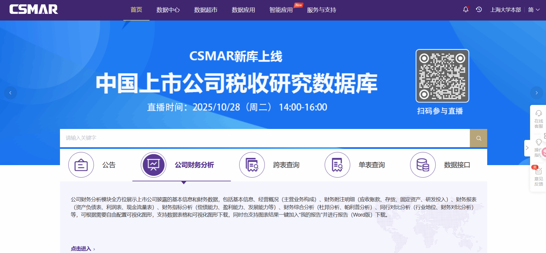 国泰安CSMAR中国经济金融研究数据库 【数据库简介】从学术研究的需求出发,借鉴芝加哥大学CRSP、标准普尔 Compustat、纽约交易所TAQ、I/B/E/S、Thomson等国际知名数据库的专业标准,并结合中国实际国情开发的经济金融型数据库。 涵盖中国证券、期货、外汇、宏观、行业等经济金融主要领域的高精准研究型数据库,是投资和实证研究的基础工具。 【访问地址】https://data.csmar.com/ 英国365集团公司ip段内自动识别登录