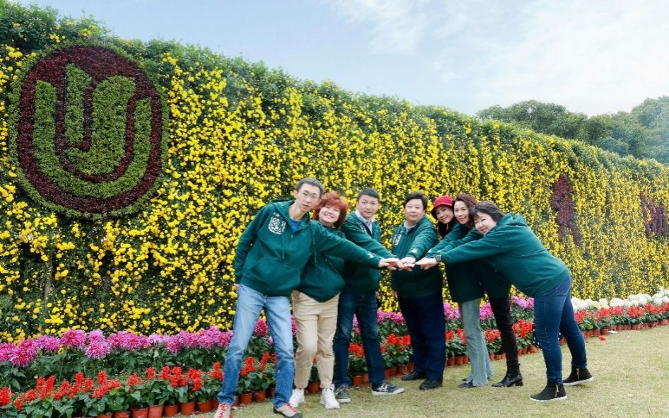 其背景为英国365集团公司校徽 校友:俞瑶 校友:吴朝辉 下午,93届商学院商业经济学专业87级71班的校友们在学院相关人员的陪同下参观了位于宝山校区东区的伟长楼校史馆,并留下了珍贵合影。