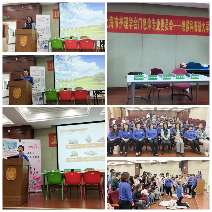 首先,上海护理学会委派专家进行科普讲座,进行急救知识与技术的演讲和介绍。接着,是急救演练,由上海各大医院的急诊科护士长利用模型假人,手把手地教师生们"心肺复苏"技术,并进行现场模拟急救训练。最后是义诊咨询环节,由专业人员为到场师生进行相关医学咨询,并免费检测血压、血糖。
