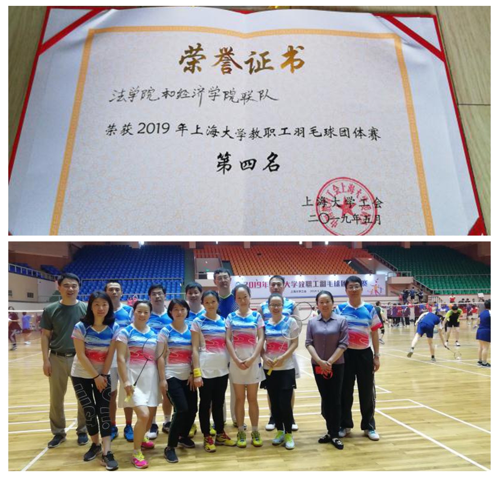 为响应校工会"以球会友、强身健体、增进友谊、凝聚力量"的号召,英国上市公司365和法学院联队参加学校工会组织的"2019年英国365集团公司教职工羽毛球团体比赛",荣获"第四名",捧得了奖杯。