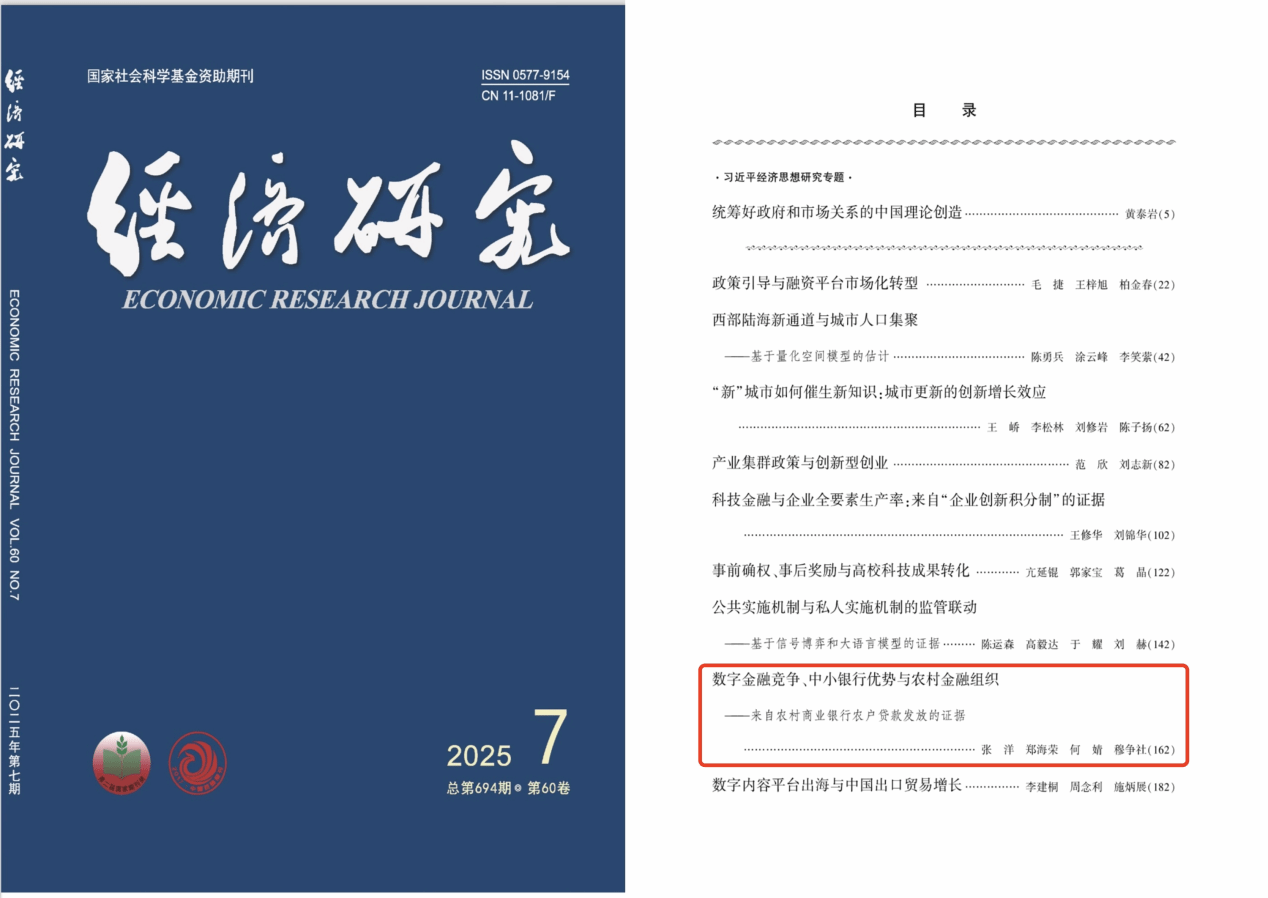 近日,英国上市公司365青年教师张洋在数字金融领域的研究取得重要进展,研究成果《数字金融竞争、中小银行优势与农村金融组织——来自农村商业银行农户贷款发放的证据》在《经济研究》2025年第7期发表。